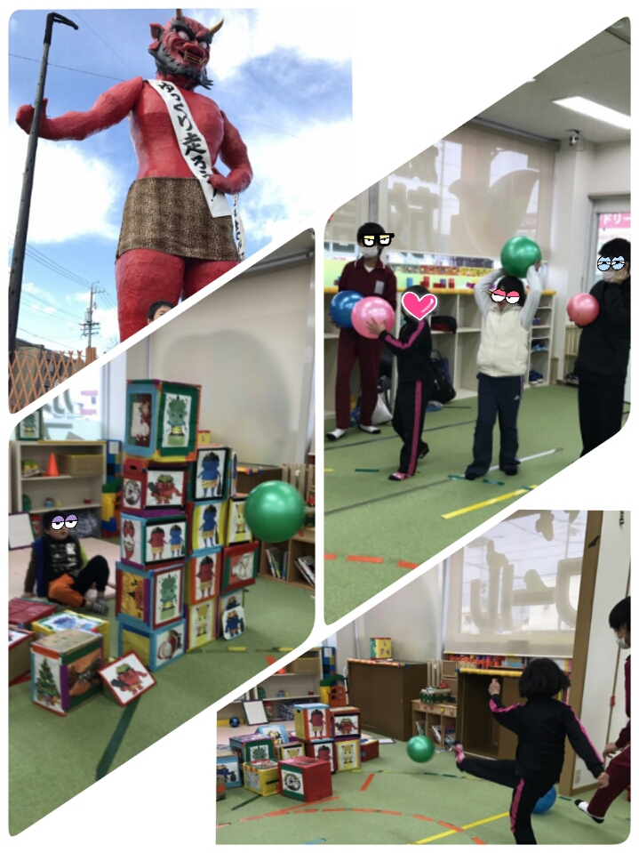 ボールをぶつけたり、キックしたりして鬼をやっつけ 今年の無病息災を祈りました。