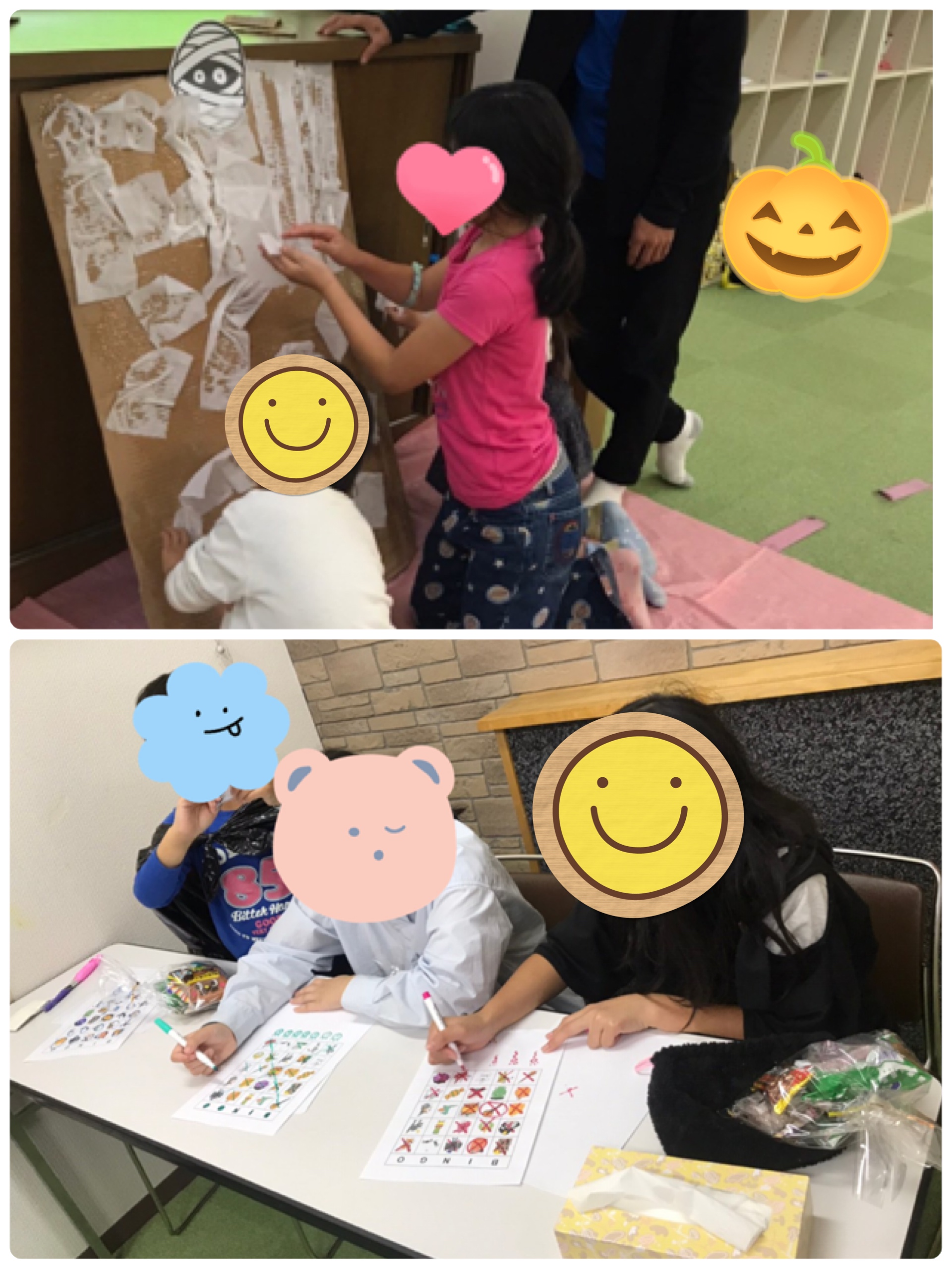 写真は、ミイラ男ゲームとハロウィンビンゴの様子です。