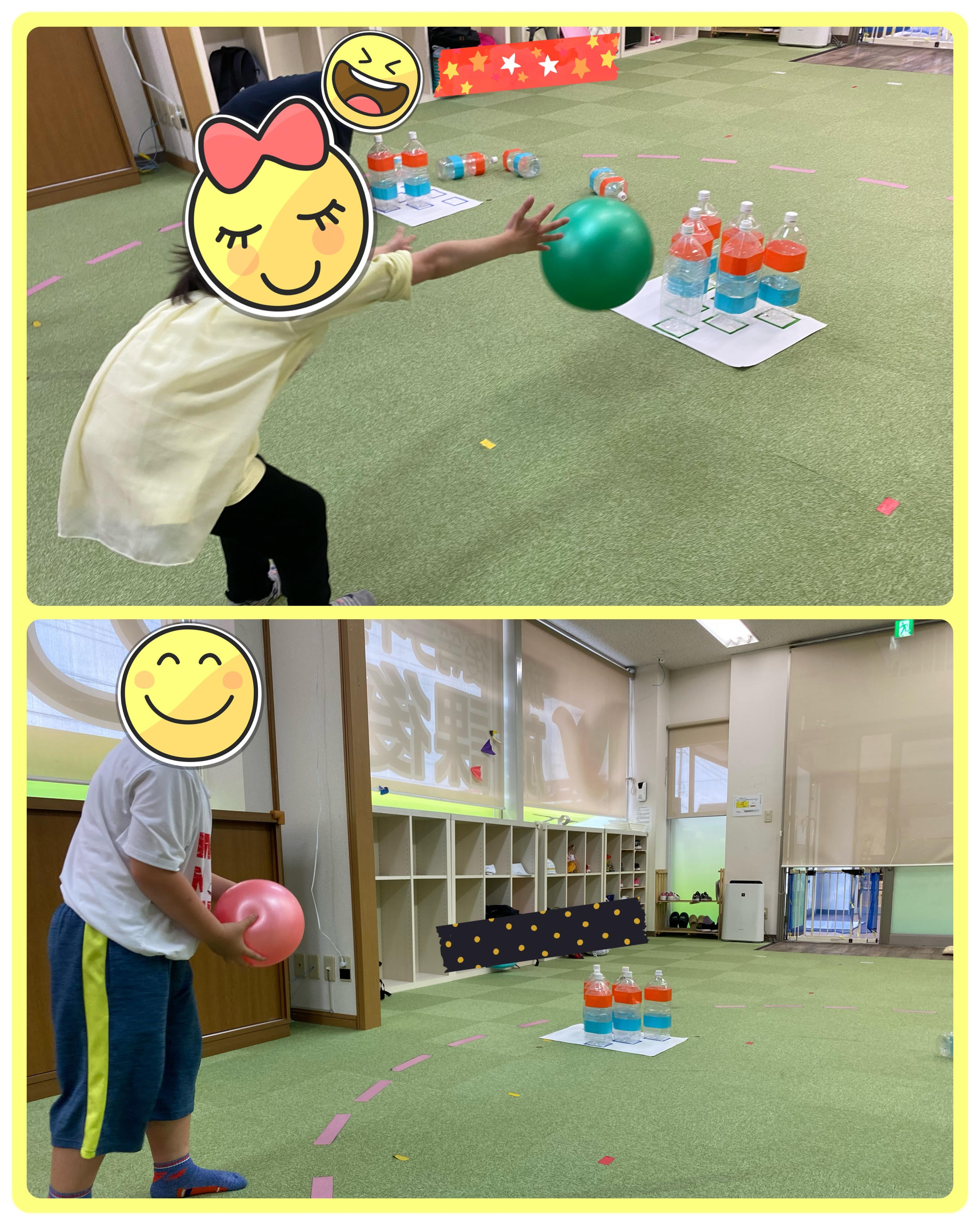 活動でボーリングをしました!ペットボトルのピンを狙ってボールを転がします