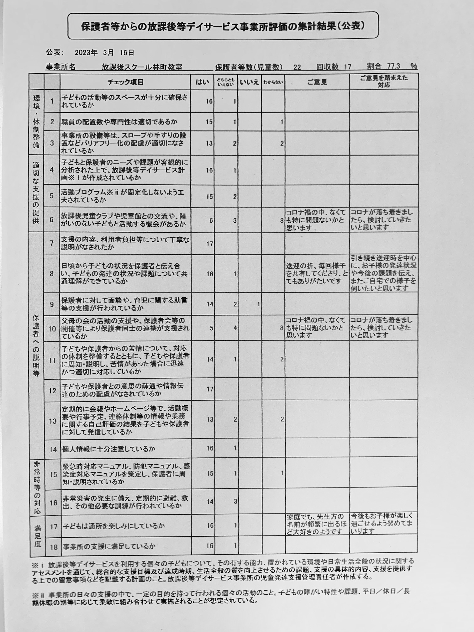 お忙しい中アンケートにご協力いただいた保護者の皆さま、ありがとうございました。