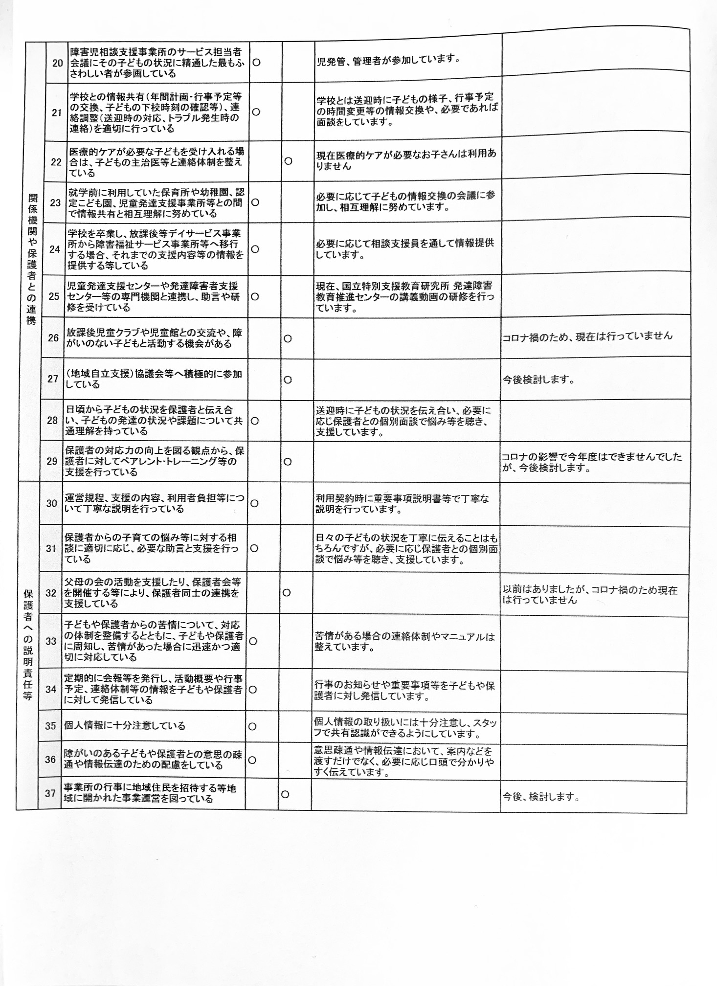 保護者の方からの事業所の評価表と同時に行いました、事業所の自己評価表の結果を掲載いたします。