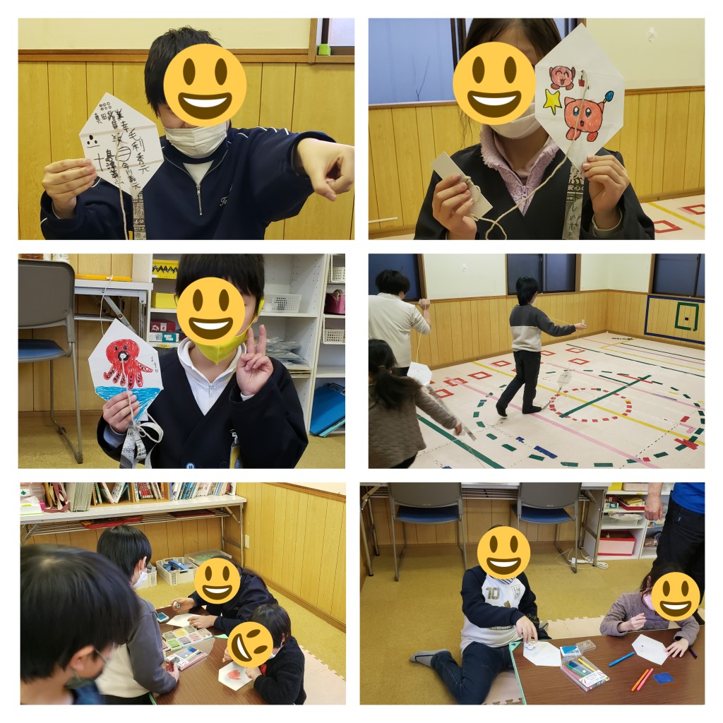 お正月といえば凧あげといくことで、ミニ凧を作ってみました。凧の絵はみんなの好きなキャラクターや歴史上の人物の名前と家紋などその子らしさがあふれてとても素敵な
