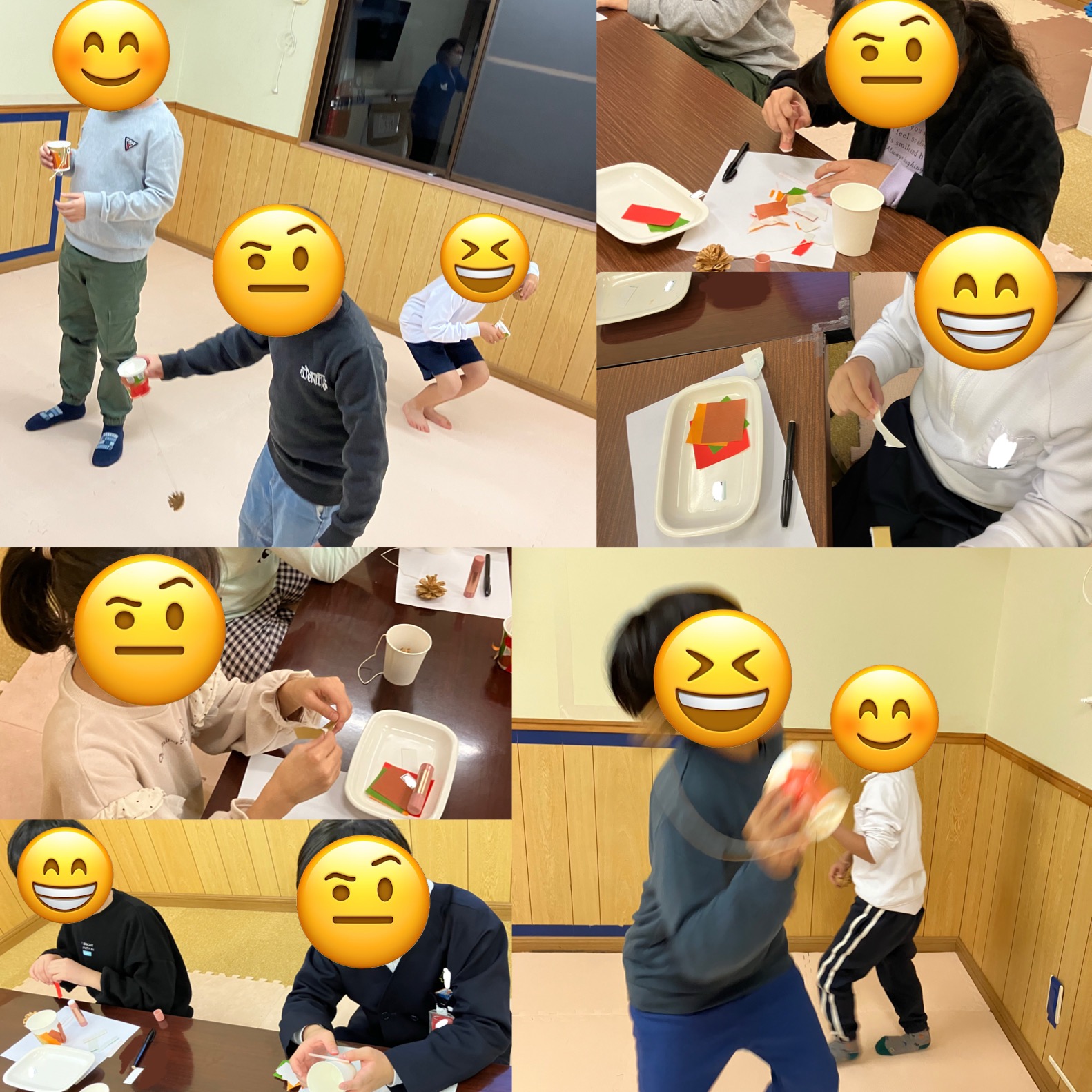 11月の工作の様子です。ミノムシけん玉を作りました。紙コップに折り紙を手でやぶいて落ち葉にみたて、次々に貼っていきます。けん玉の玉は松ぼっくりです。秋らしけん玉ができました。