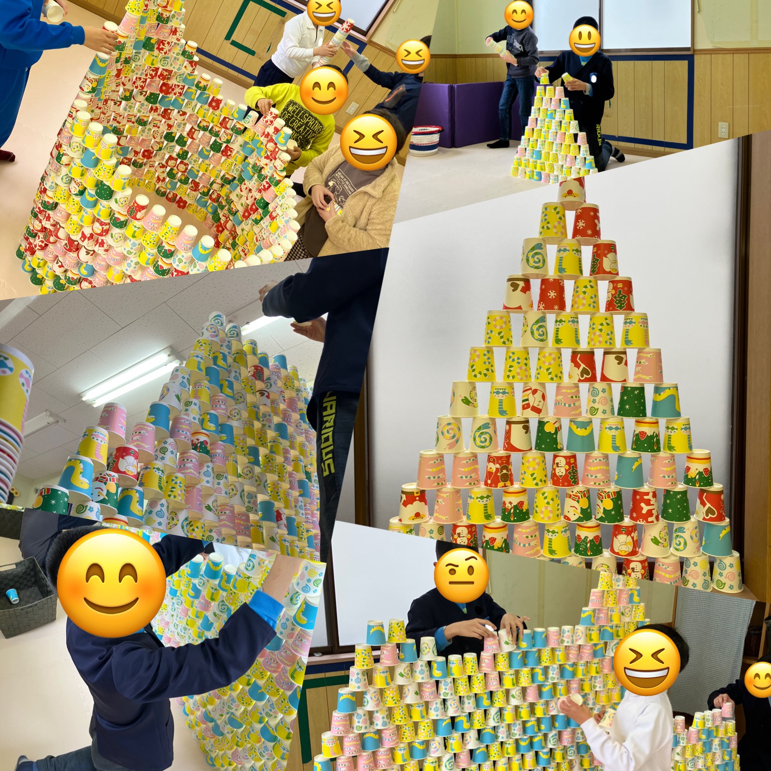 12月とある日の自由時間の様子です。紙コップをたくさん頂いたので、紙コップでお友達が2人高く積んで遊んでいました。そこへ、他のお友達もやってみようとどんどん集まってきて、みんなで協力していろんな形をしたタワーができました。何度も崩しては積みなおしたりして、1時間以上遊んでいました。興味を持ってできることはとてもいいことですね。