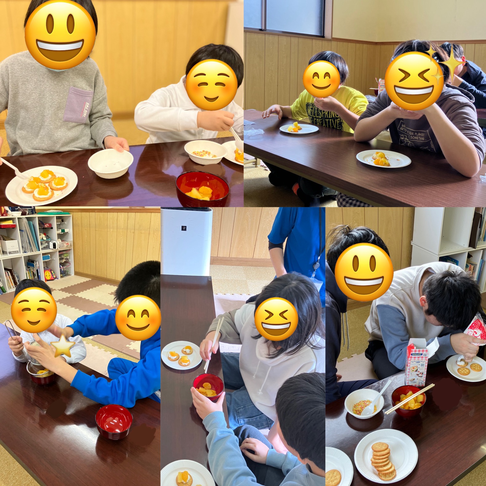 おやつにカナッペ作りをしました。ペアになって材料をそろえて、交代で生クリームやフルーツをのせて完成させました。自分で作るおやつは格別おいしく感じますね。