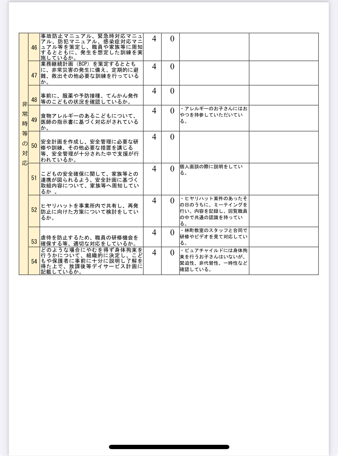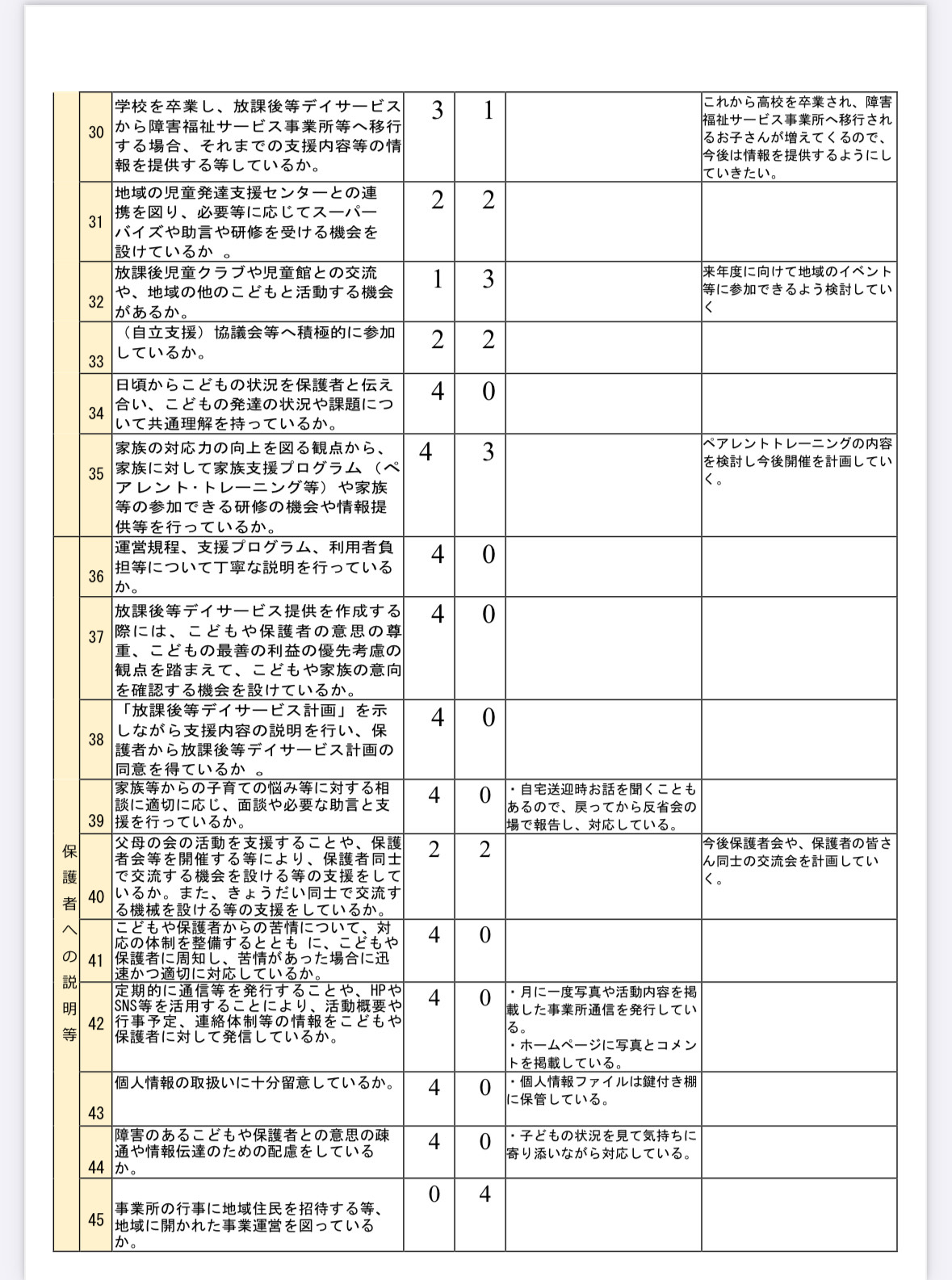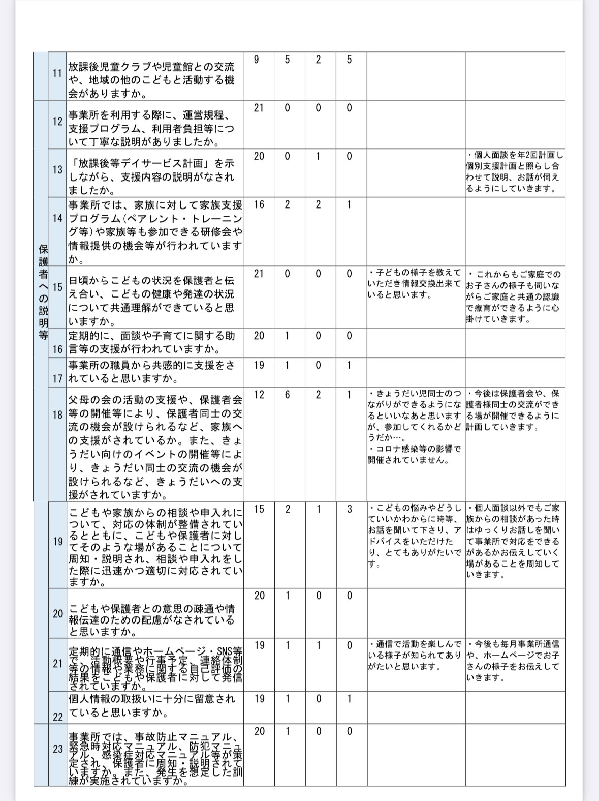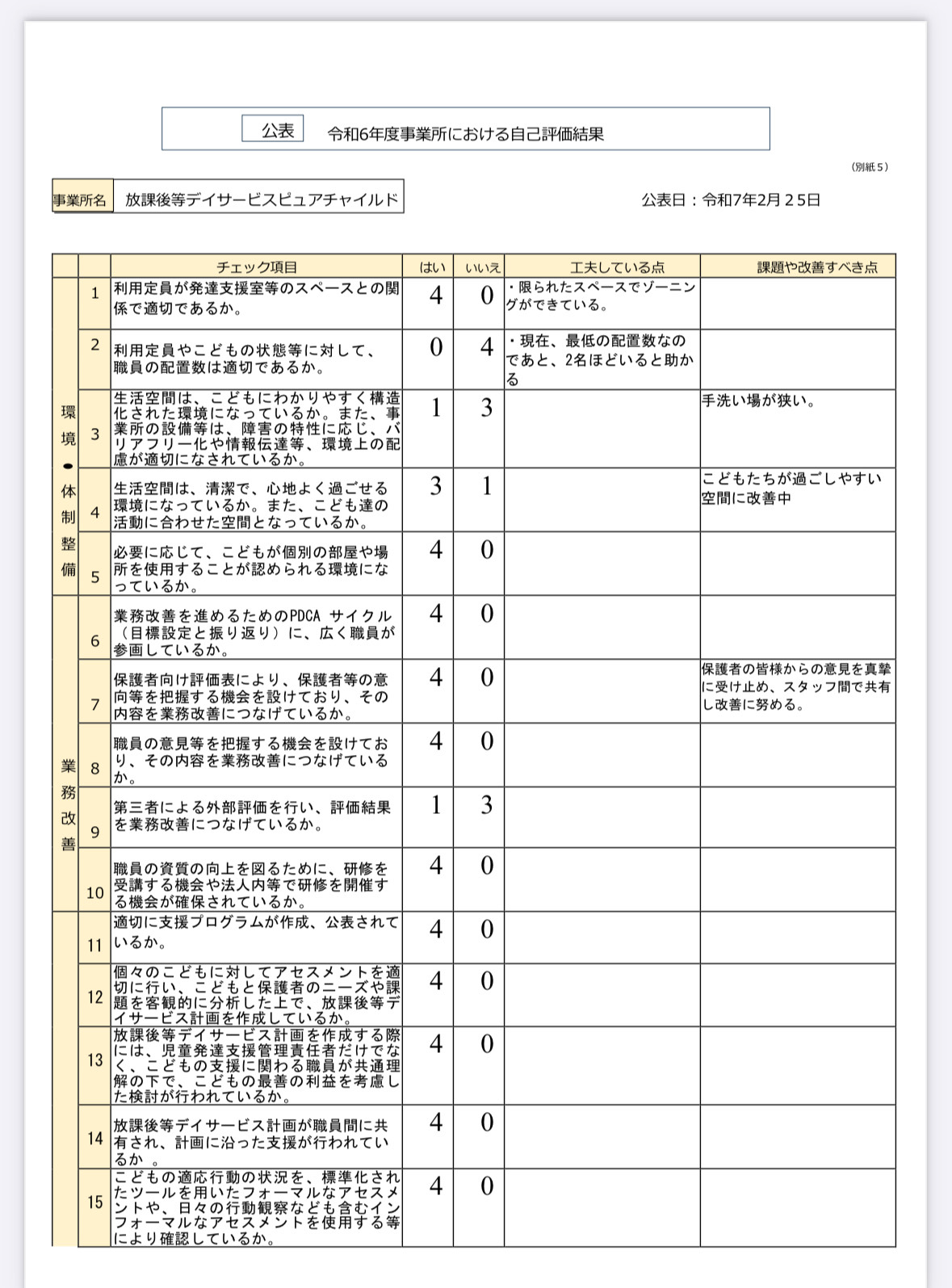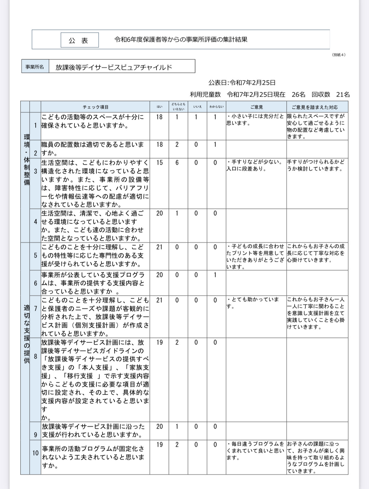 令和6年度2回目のピュアチャイルドに関する事業所評価表を保護者の皆様にご協力いただきました。お忙しいなか、ご意見や、暖かいお言葉をいただきありがとうございました。事業所における自己評価表と総括表と合わせて結果をお知らせいたします。ともより良い事業所になるように日々、努めてまいりますので、今後ともどうぞよろしくお願い致します。