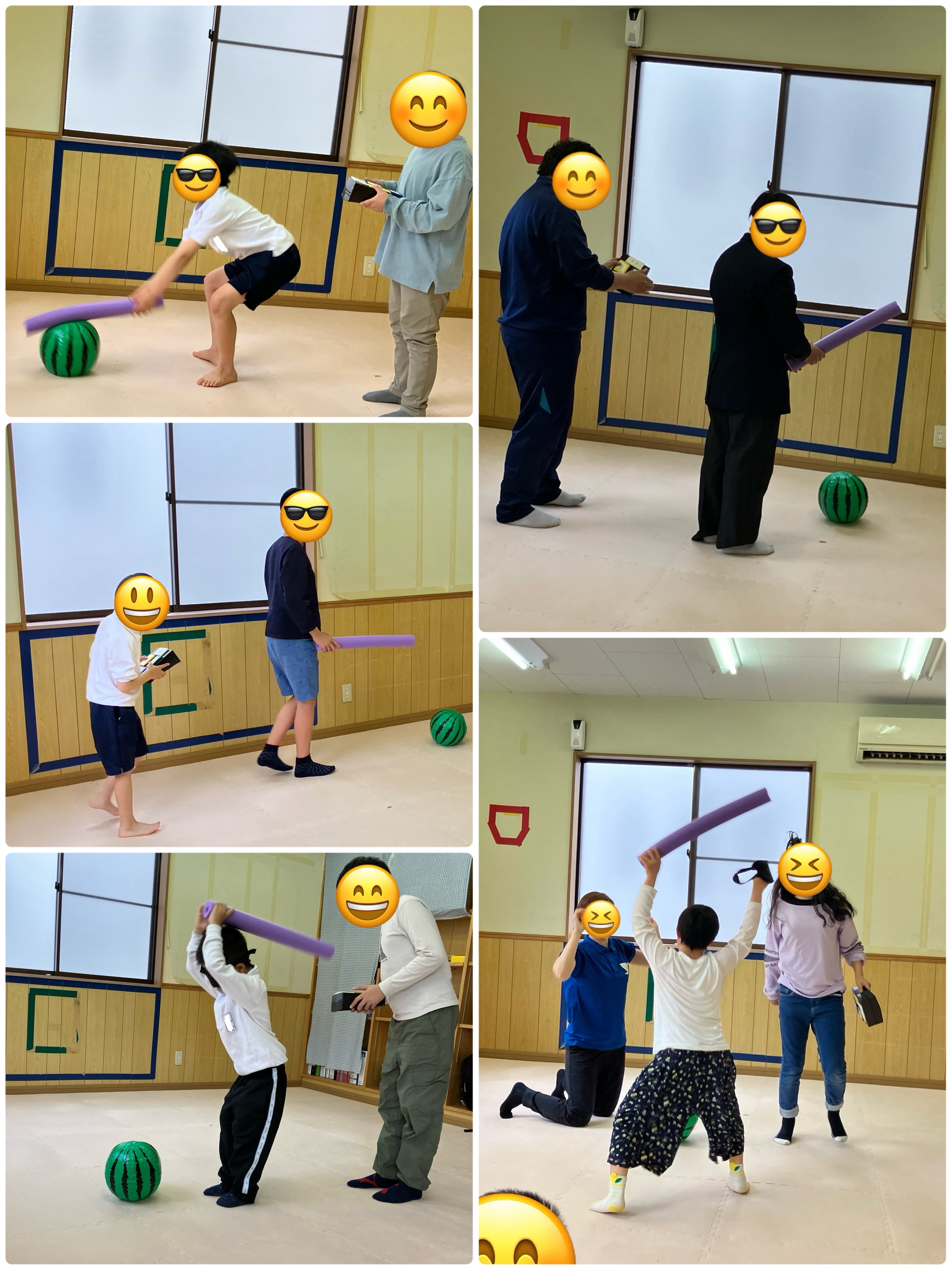 2人ペアになり、方向を相手の動きをみながら指示をだして、すいかのボールを叩けるようにする遊びです。左右・前後の指示をよく聞いて、無事スイカのボールを叩くことができました。