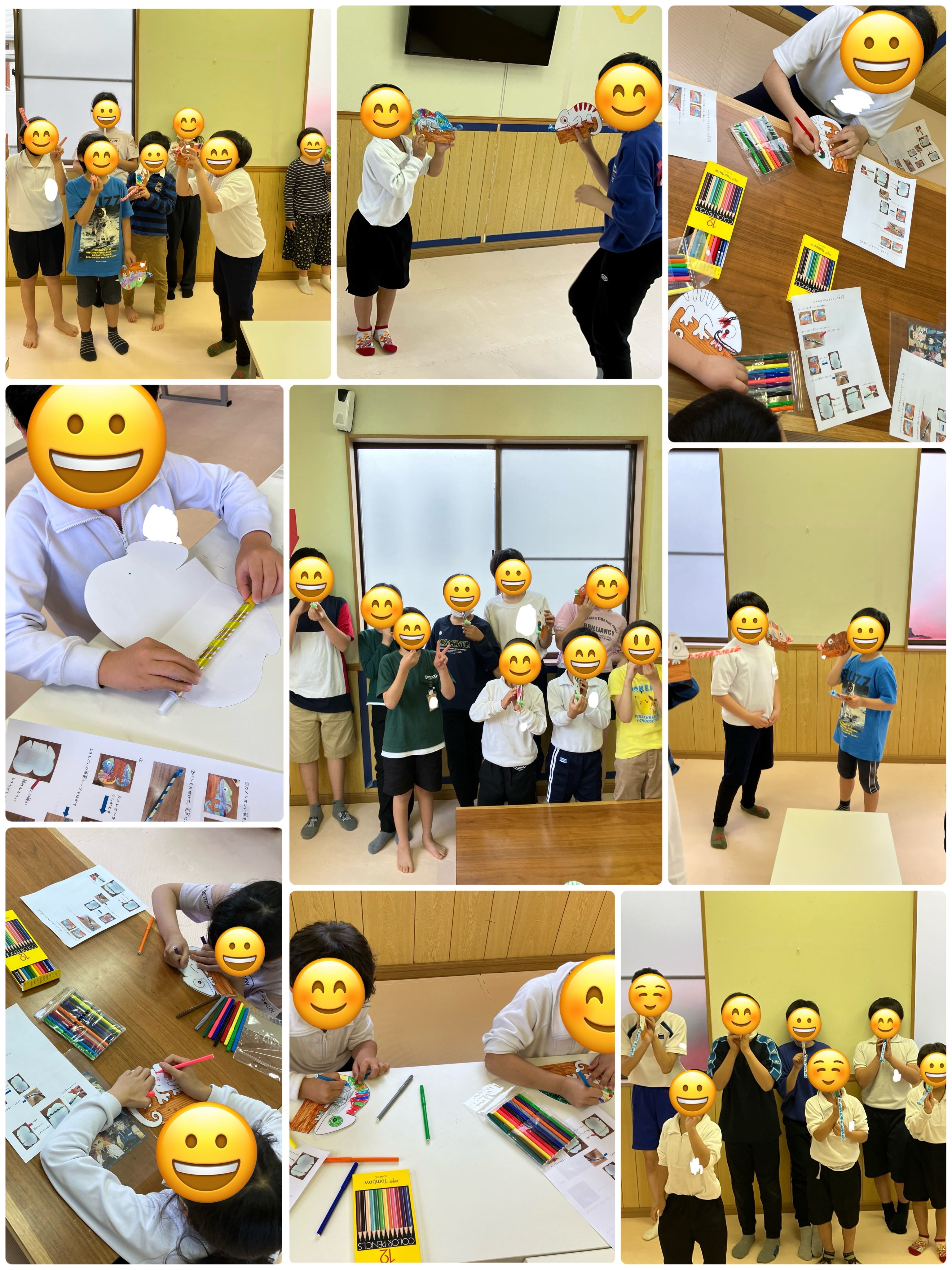 5月の工作では、ピロピロ笛ともいわれる吹き戻しに、カメレオンのイラストに好きな色を塗って取付けました。唇をすぼめて空気を吹き出すので口輪筋や頬金を鍛えることができます。完成後はみんなでピロピロ〜と遊びました。