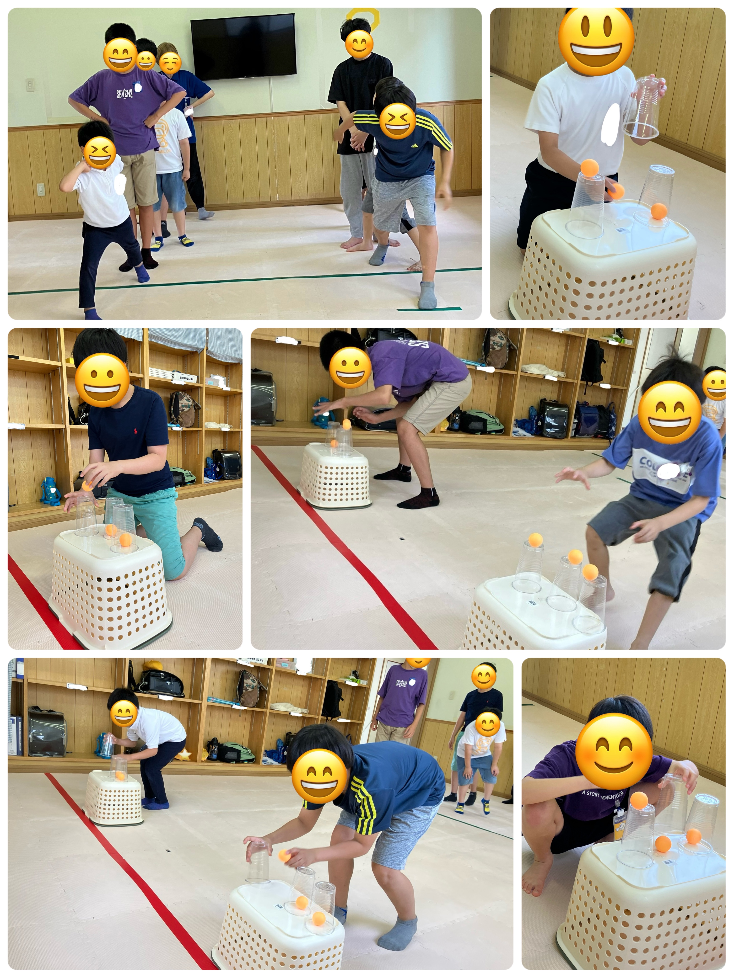 ピンポン玉上げ下げゲームの様子です。コップを逆さにして底の上にピンポン玉を置く、コップの中に入れるを交互に繰り返す動作をリレー方式で行いました。ピンポン玉がコップから落ちないように慎重に、でも手際よくできていてとても良かったです。ゲーム感覚で集中力や力加減を身につけていきます。