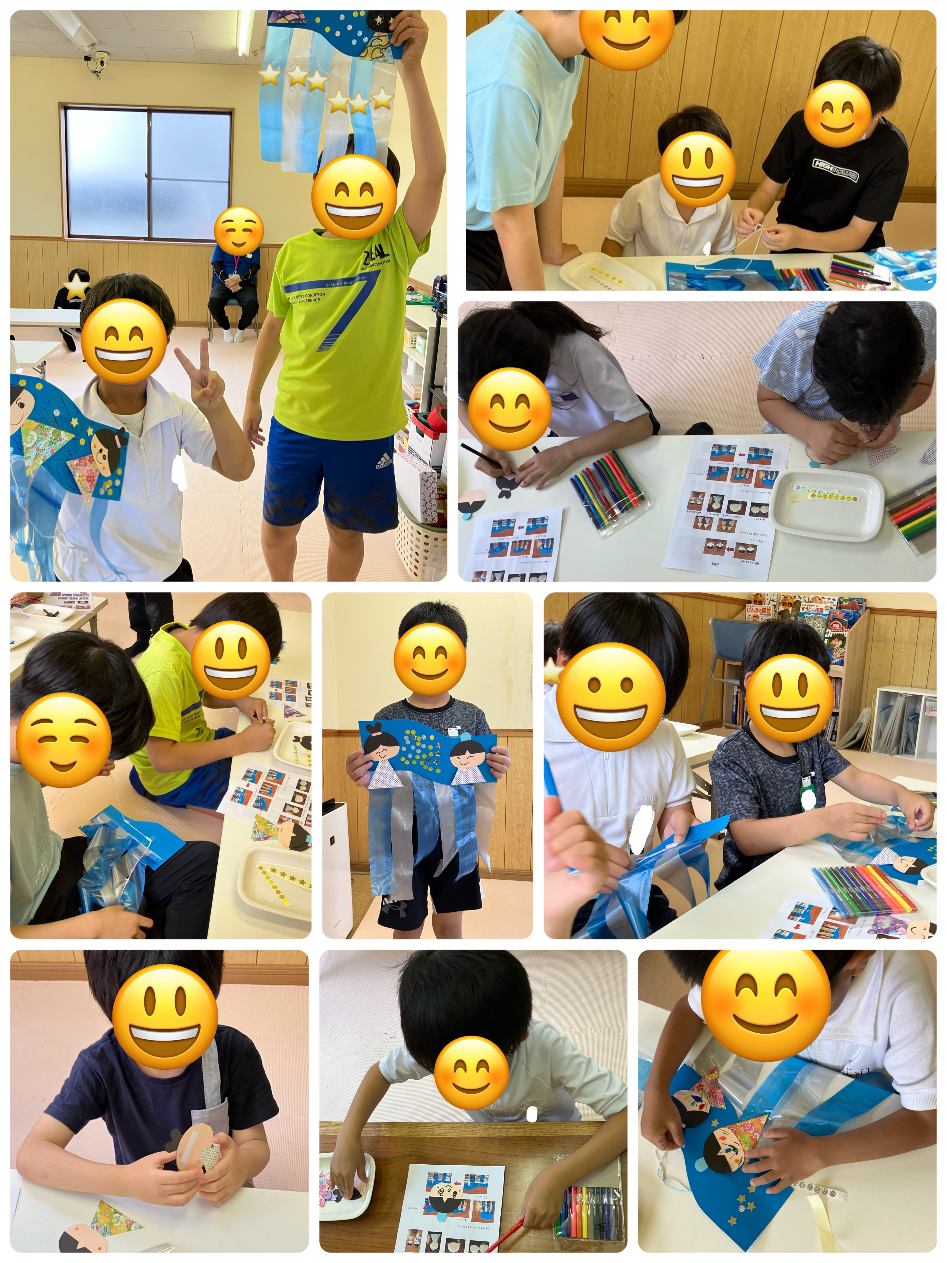 工作の様子です。6月は織姫と彦星の顔を書いて天の川に自由にはり、ビニールテープを思い思いにさいて星のシールを貼りました。いろんな表情の織姫と彦星や貼り方によって印象もかわり、素敵な作品がたくさんできました。