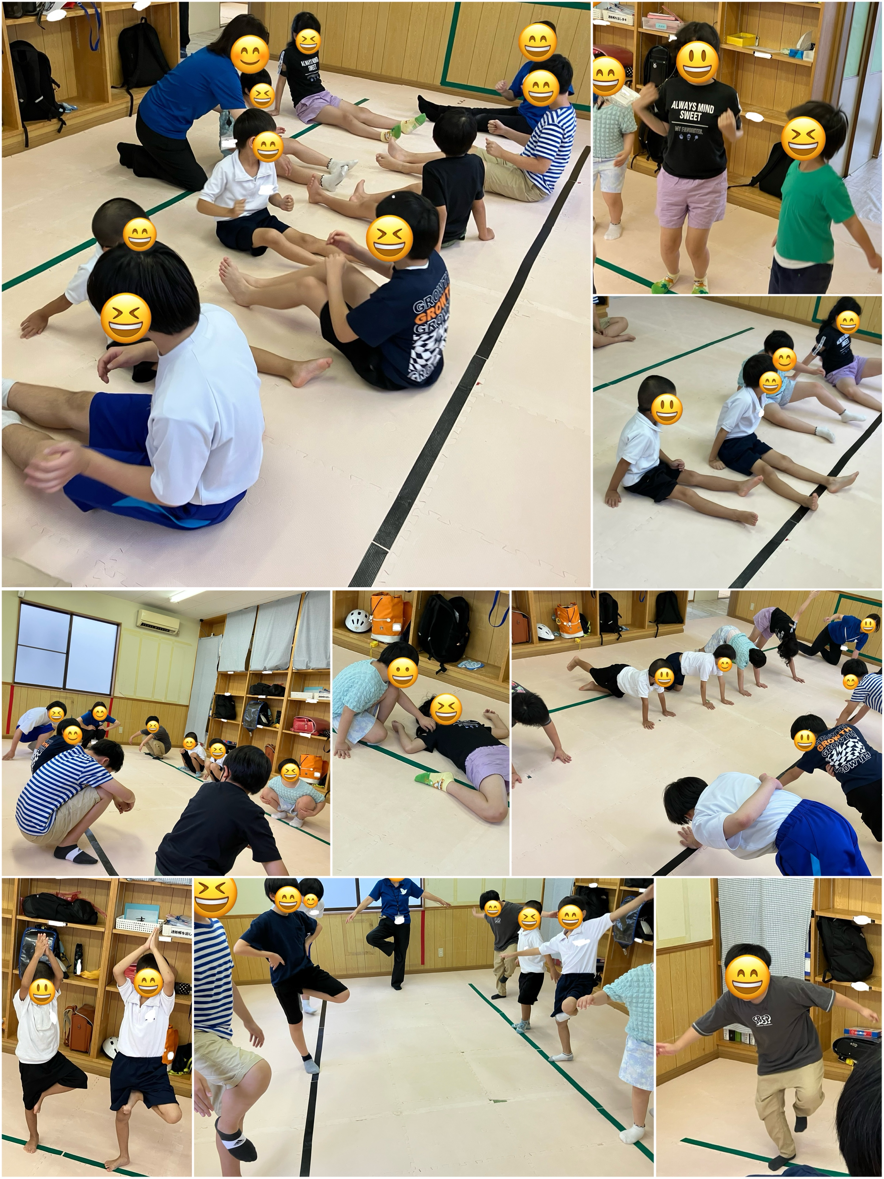 かかとを地面につけたまましゃがみこみや、片足バランス、腕立てバランスやお尻歩きをしました♪