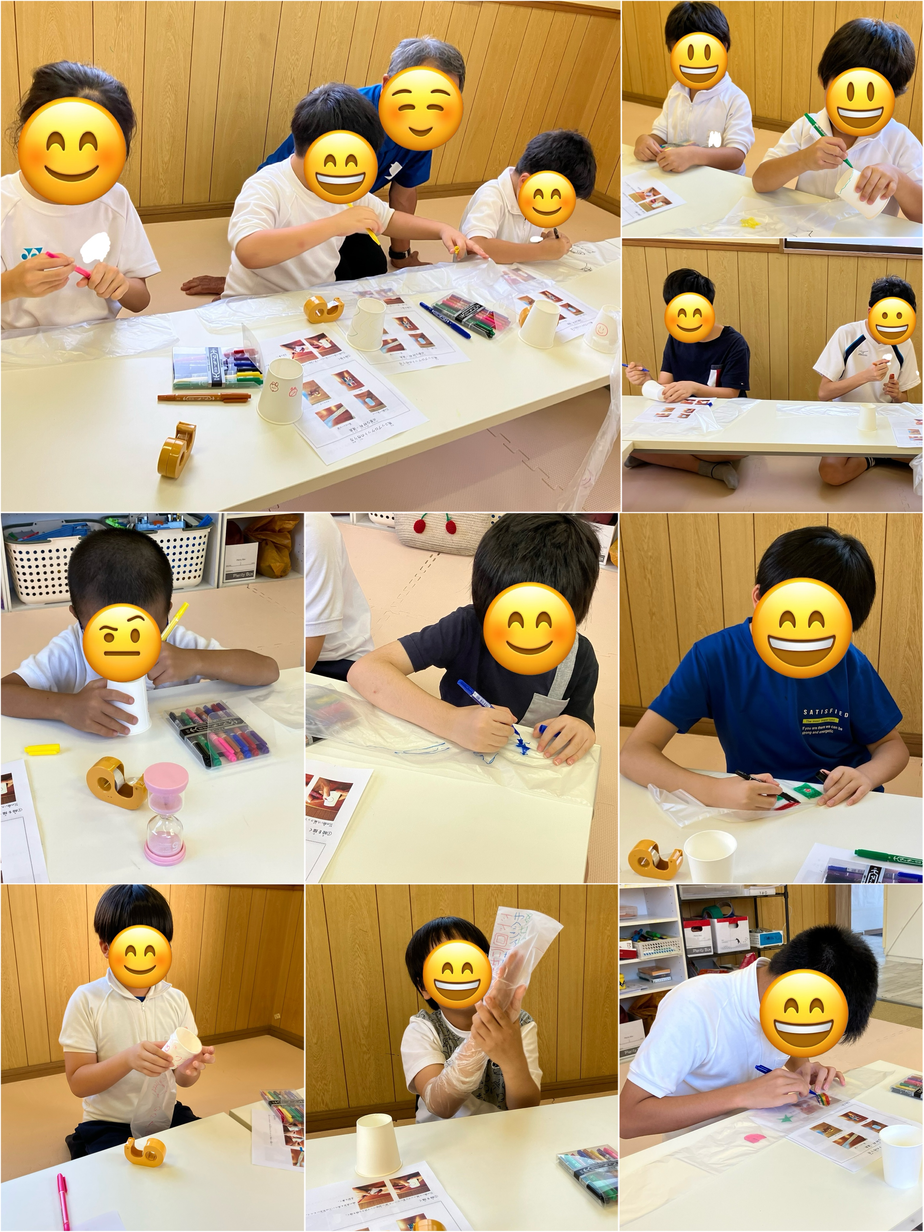 傘袋と底のない紙コップに好きな絵を描きました。