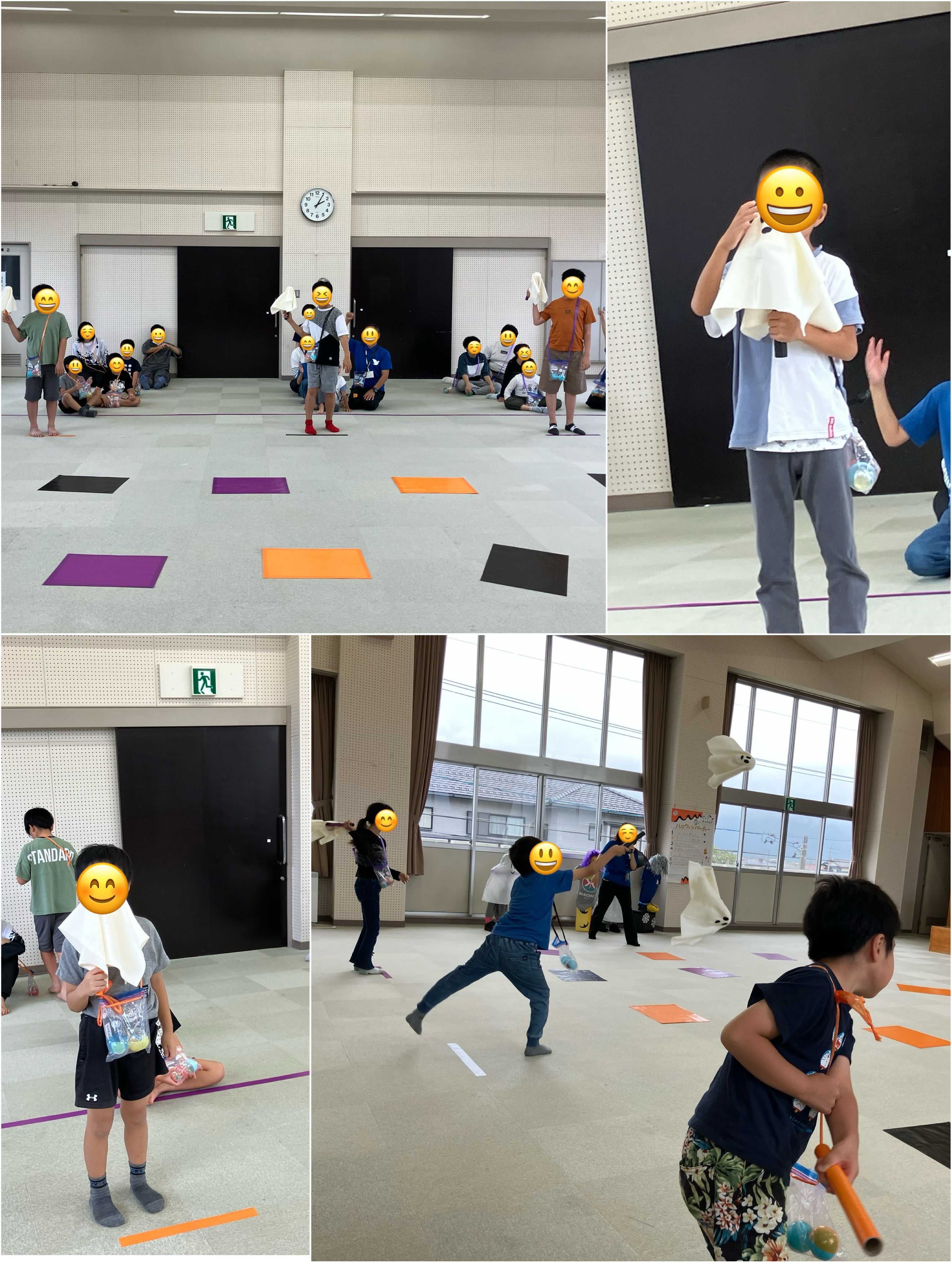ゲームごとにお菓子がもらえるので、みんな肩にお菓子袋をかけてゲームをしました♪