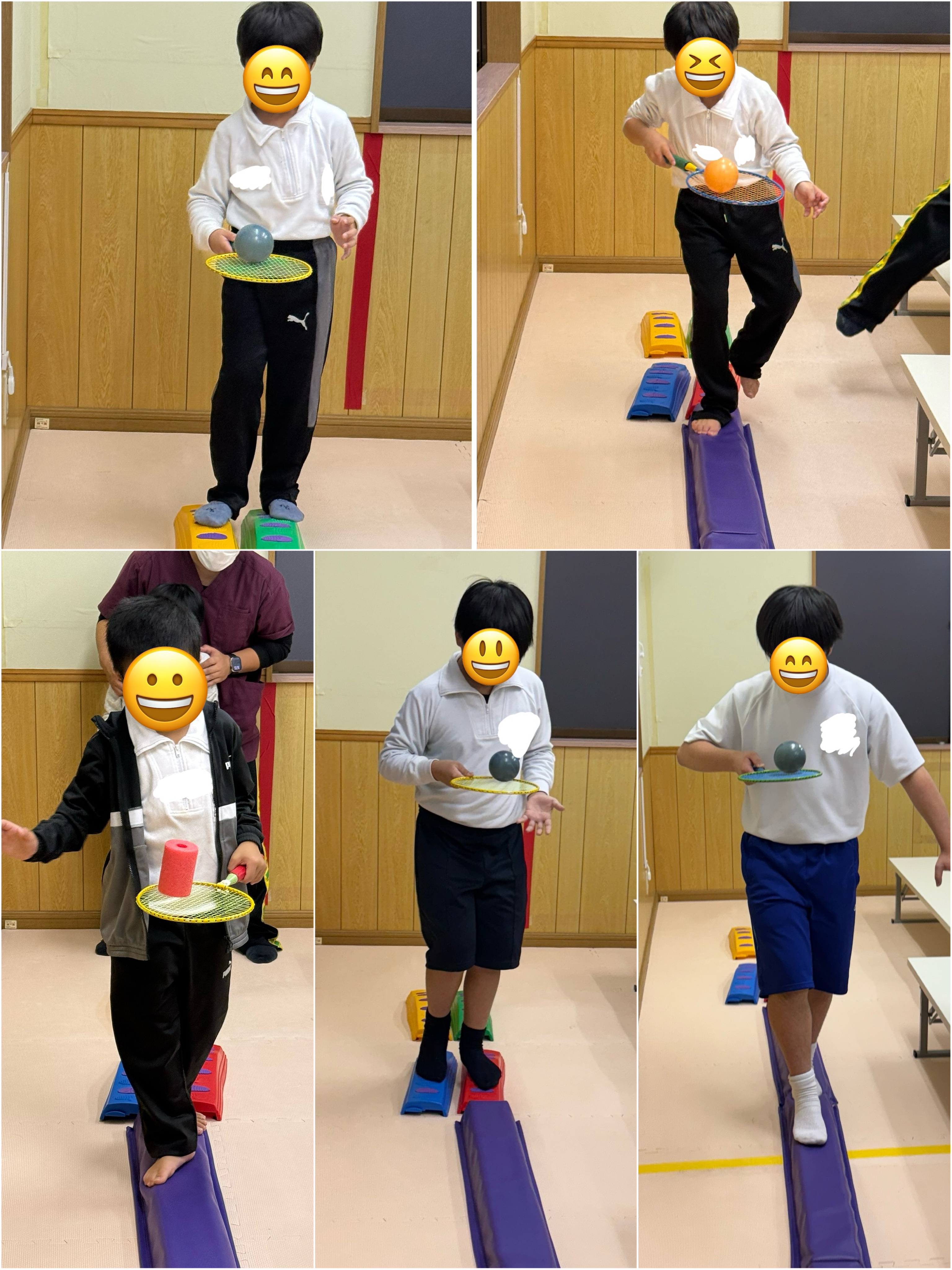 スポンジ棒をまたぎ、細い道をくねくね歩き、最後は平均台!