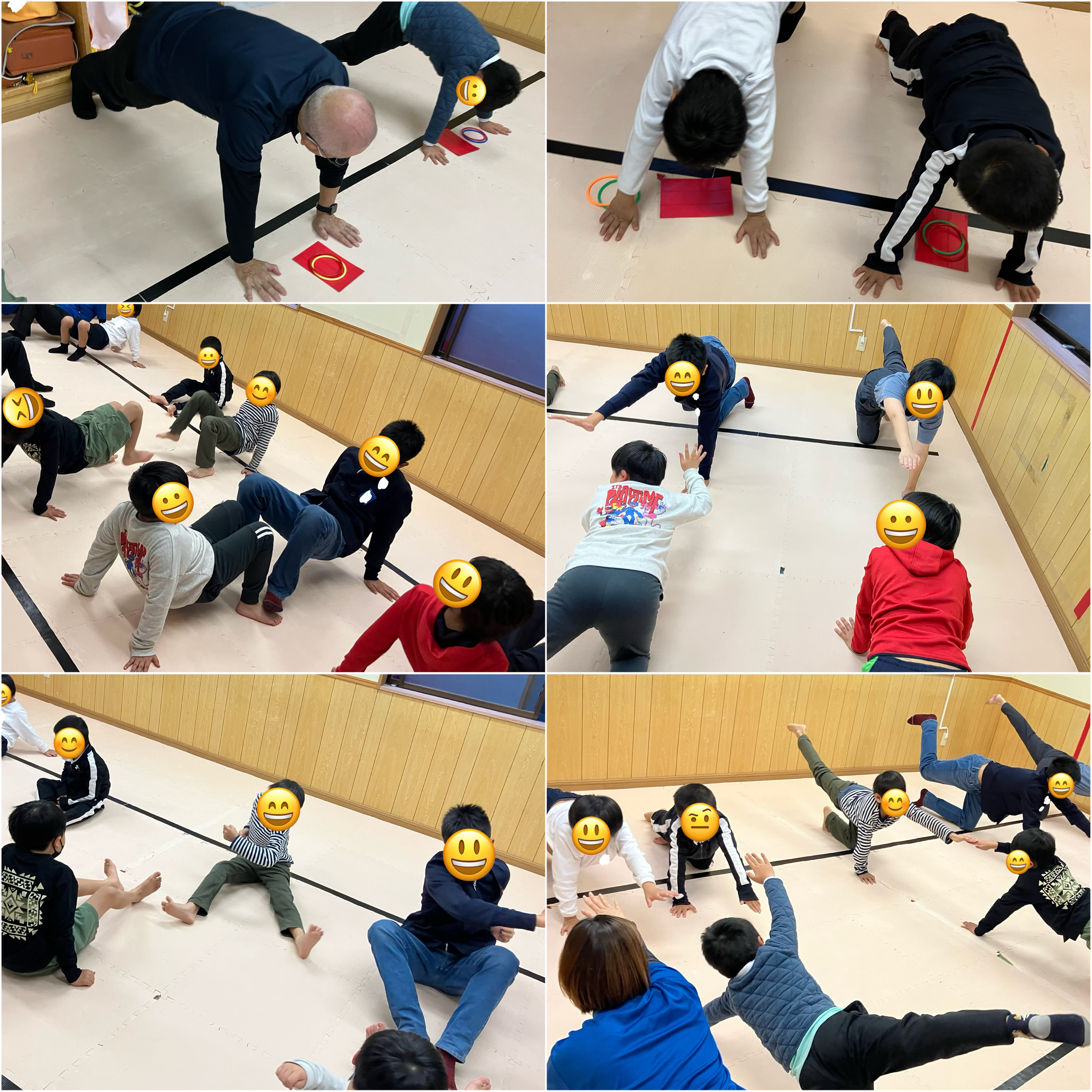 いつものお尻歩きや、クモ歩きに加え、今回は少し難しく、腕立ての体勢でものを移動させる運動もしました。