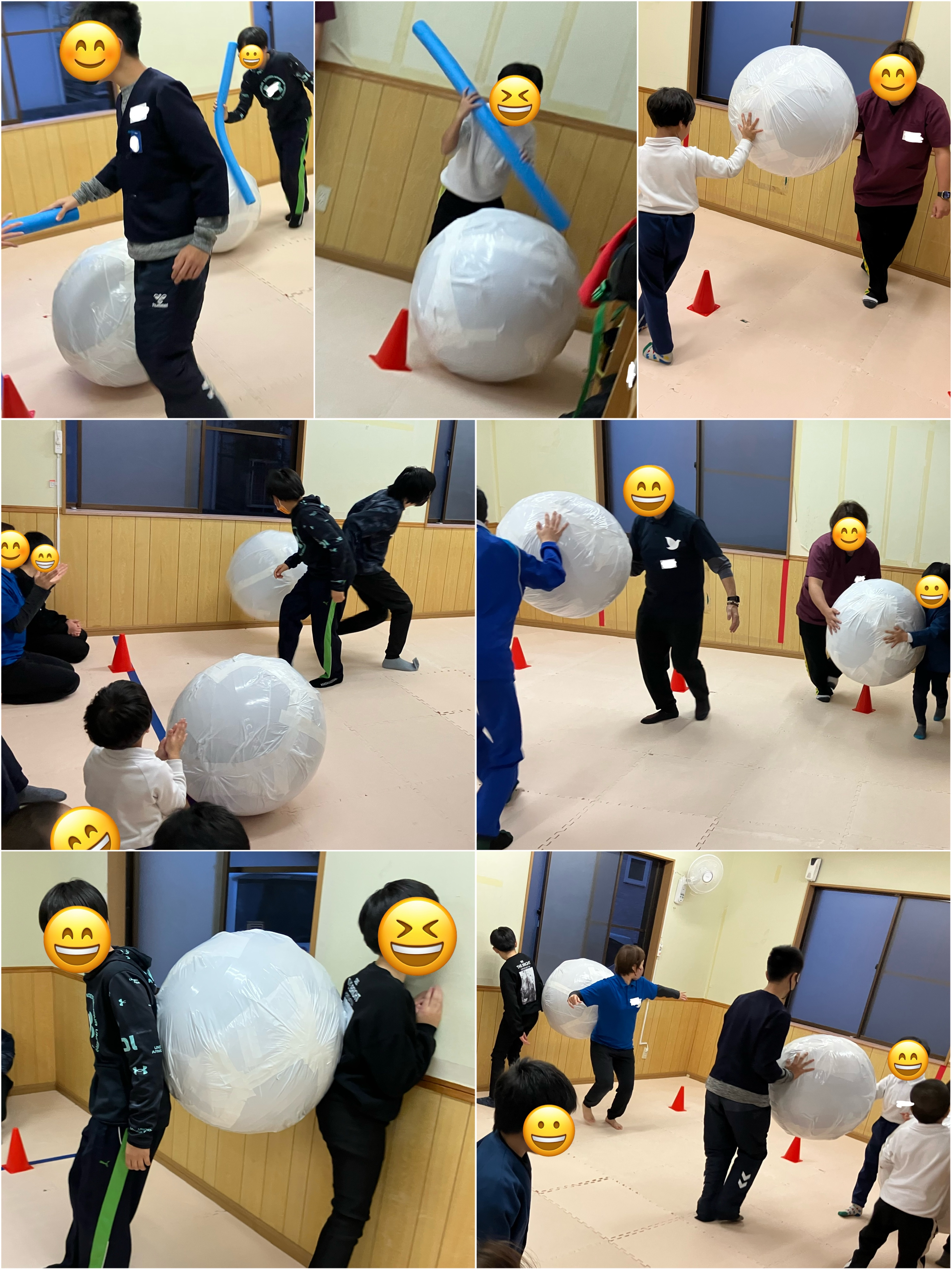 お友達やスタッフと背中合わせで運んでみたり、手のひらで運んでみたり、全身を使うことができました💪