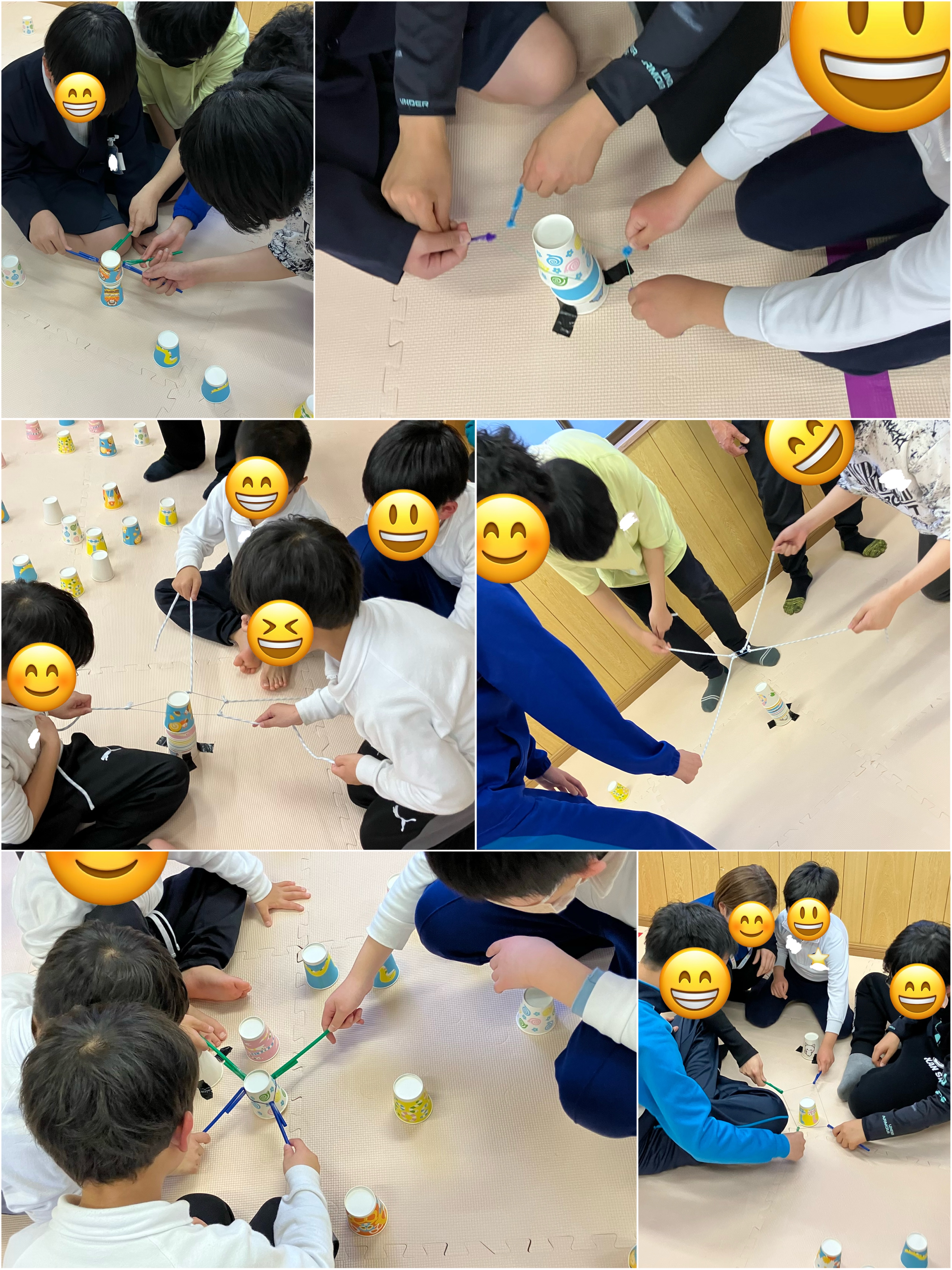 1回目はレオ先生が持ってきてくれた4人で協力して紙コップを運べる道具を使い、紙コップをどれだけたくさん運べるかを競うゲームをしました!