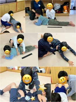 最初はすぐにひっくり返されていたお友達も、何度も繰り返し挑戦していくうちにひっくり返されないような体の使い方がわかってきました✨