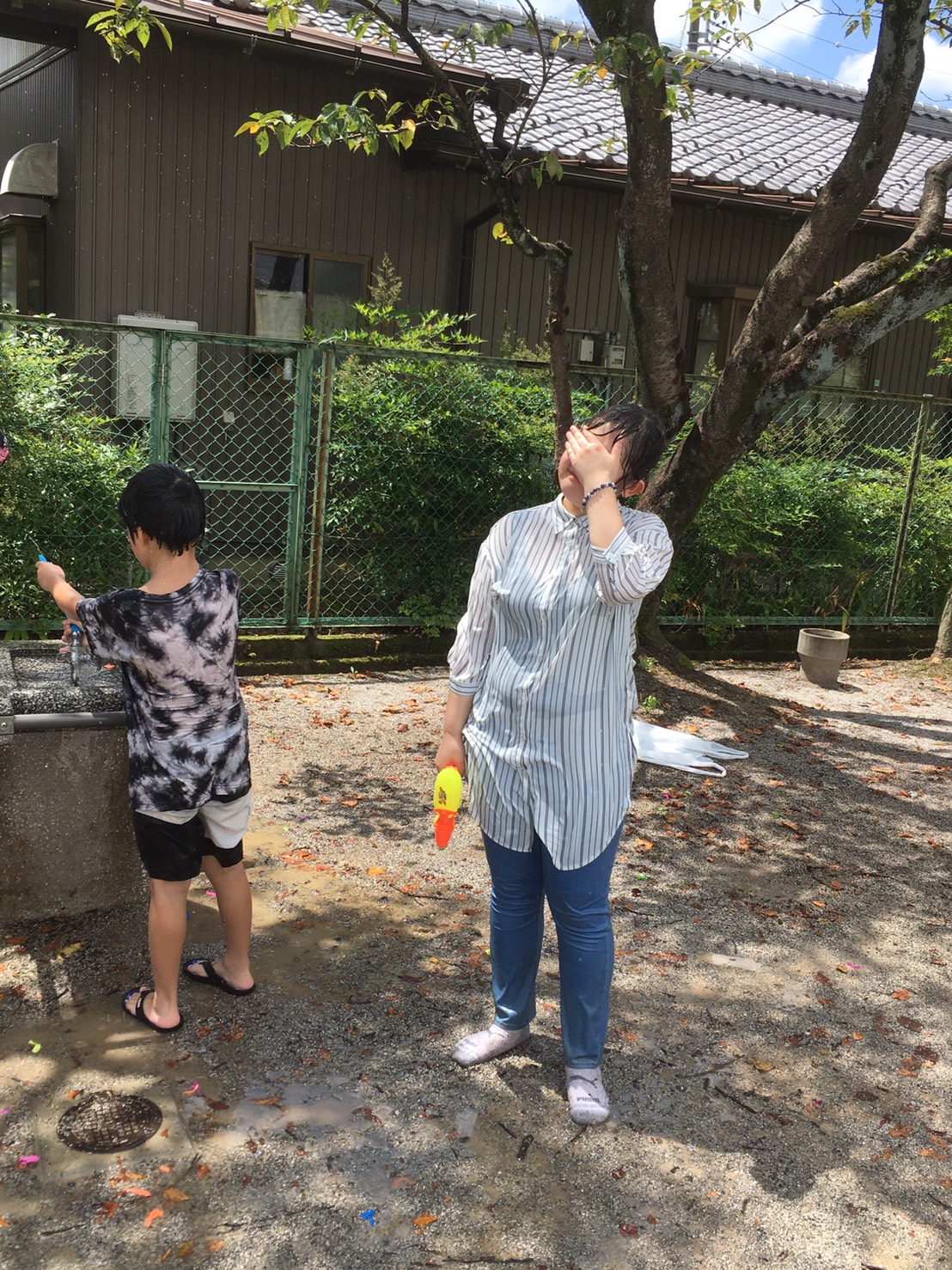 水遊びは、気温が低い日の午前中に、公園の日陰で水鉄砲や水風船を使って遊びました。