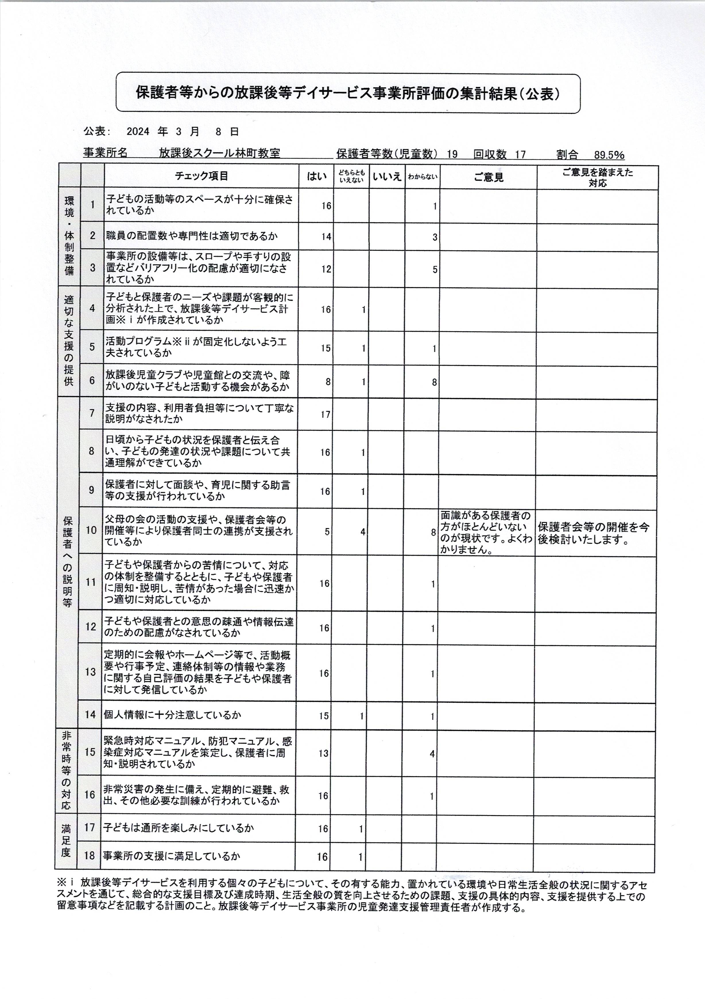 お忙しい中アンケートにご協力いただいた保護者の皆様ありがとうございました。