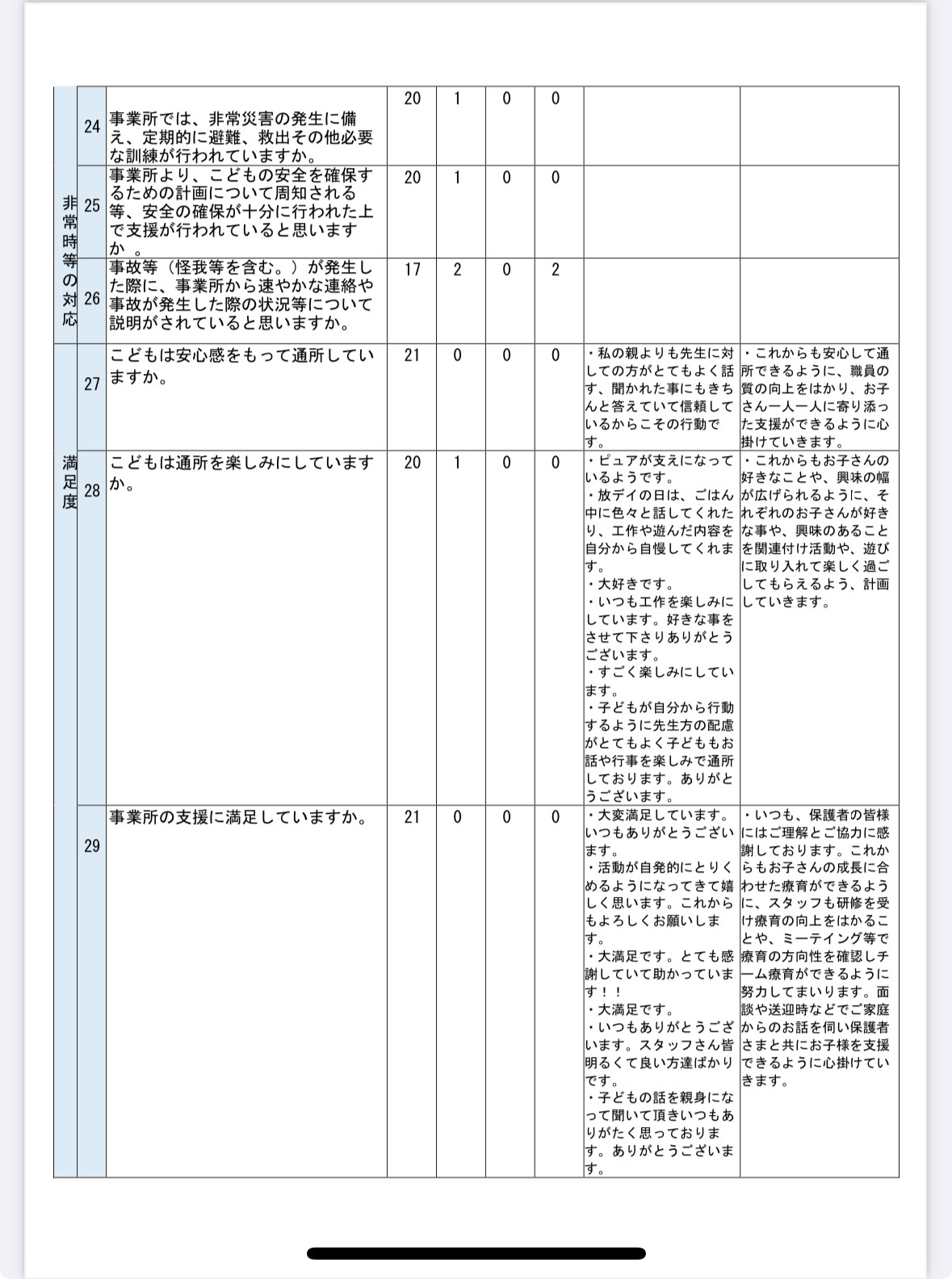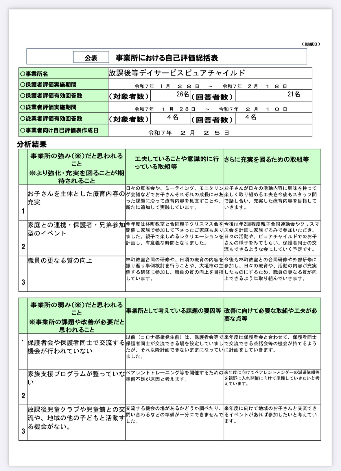 令和6年度2回目のピュアチャイルドに関する事業所評価表を保護者の皆様にご協力いただきました。お忙しいなか、ご意見や、暖かいお言葉をいただきありがとうございました。事業所における自己評価表と総括表と合わせて結果をお知らせいたします。ともより良い事業所になるように日々、努めてまいりますので、今後ともどうぞよろしくお願い致します。