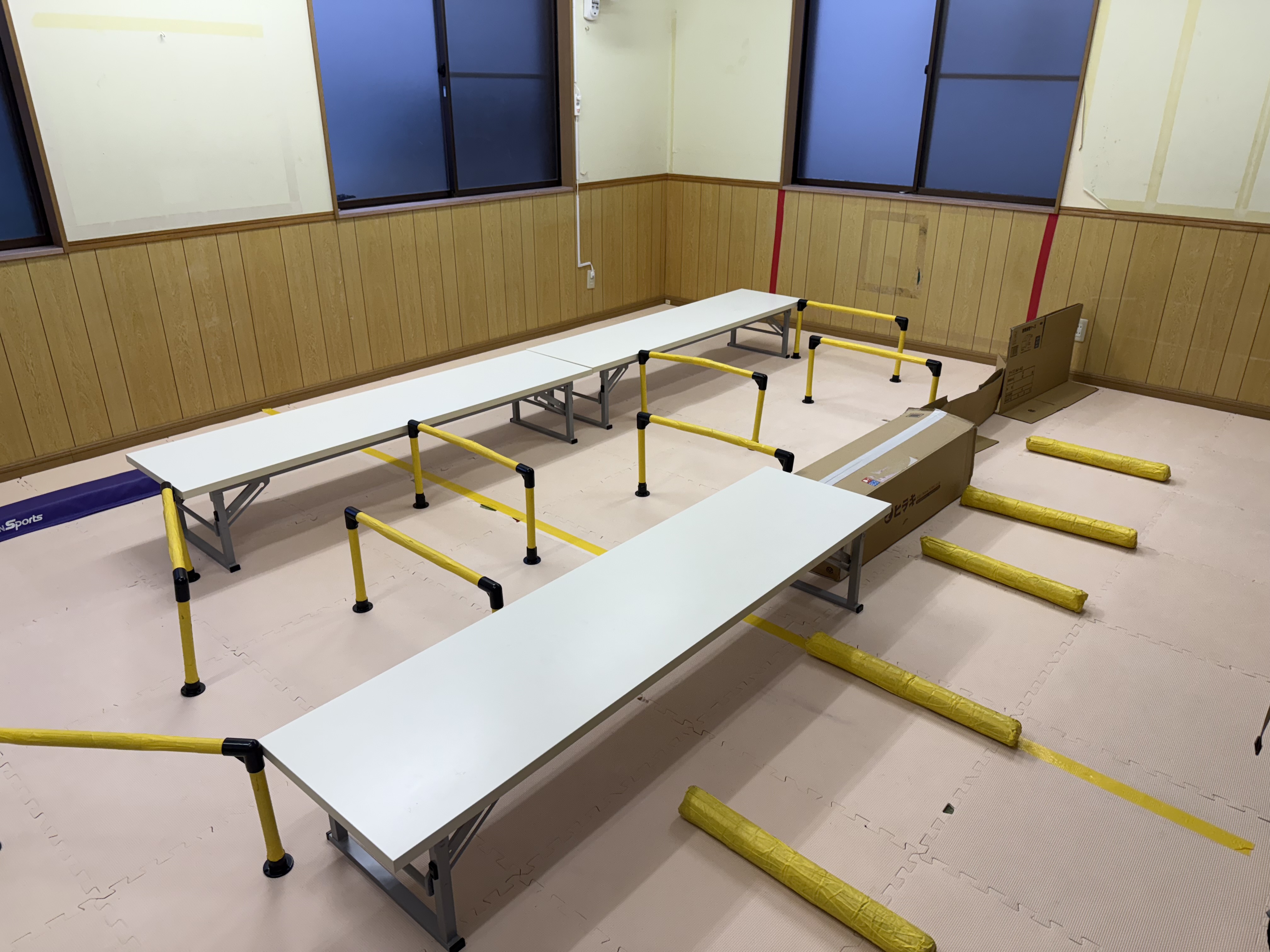 スポンジ棒をまたぎ、細い道をくねくね歩き、最後は平均台!