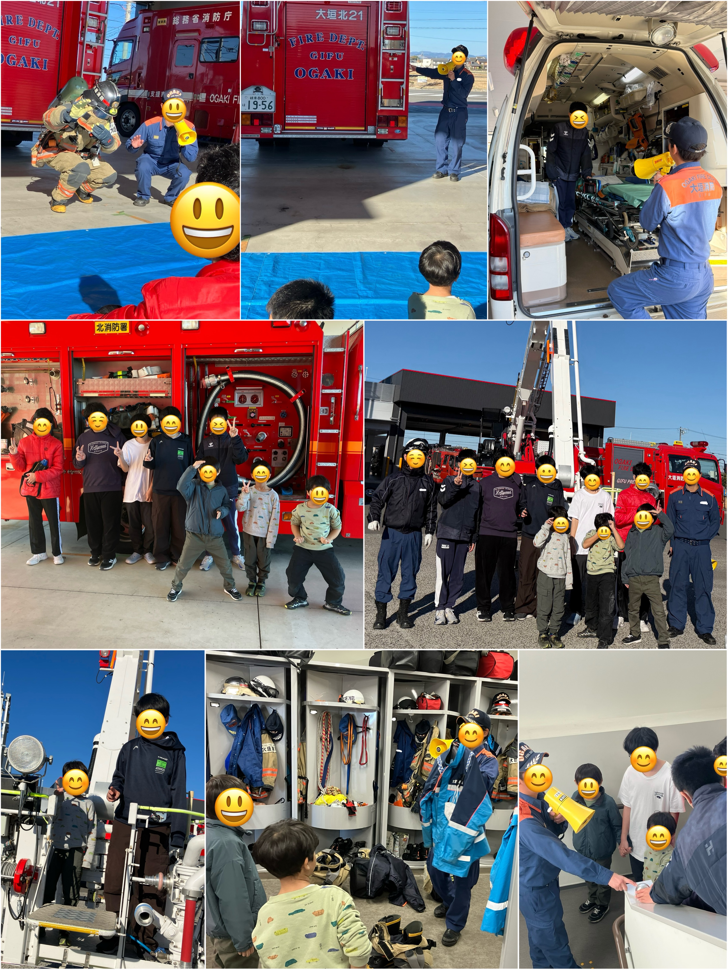 消火活動をする際の服装を着てもらったり、救急車に乗せてもらったり、消防士さんが仮眠をするお部屋なども見せていただきました!!