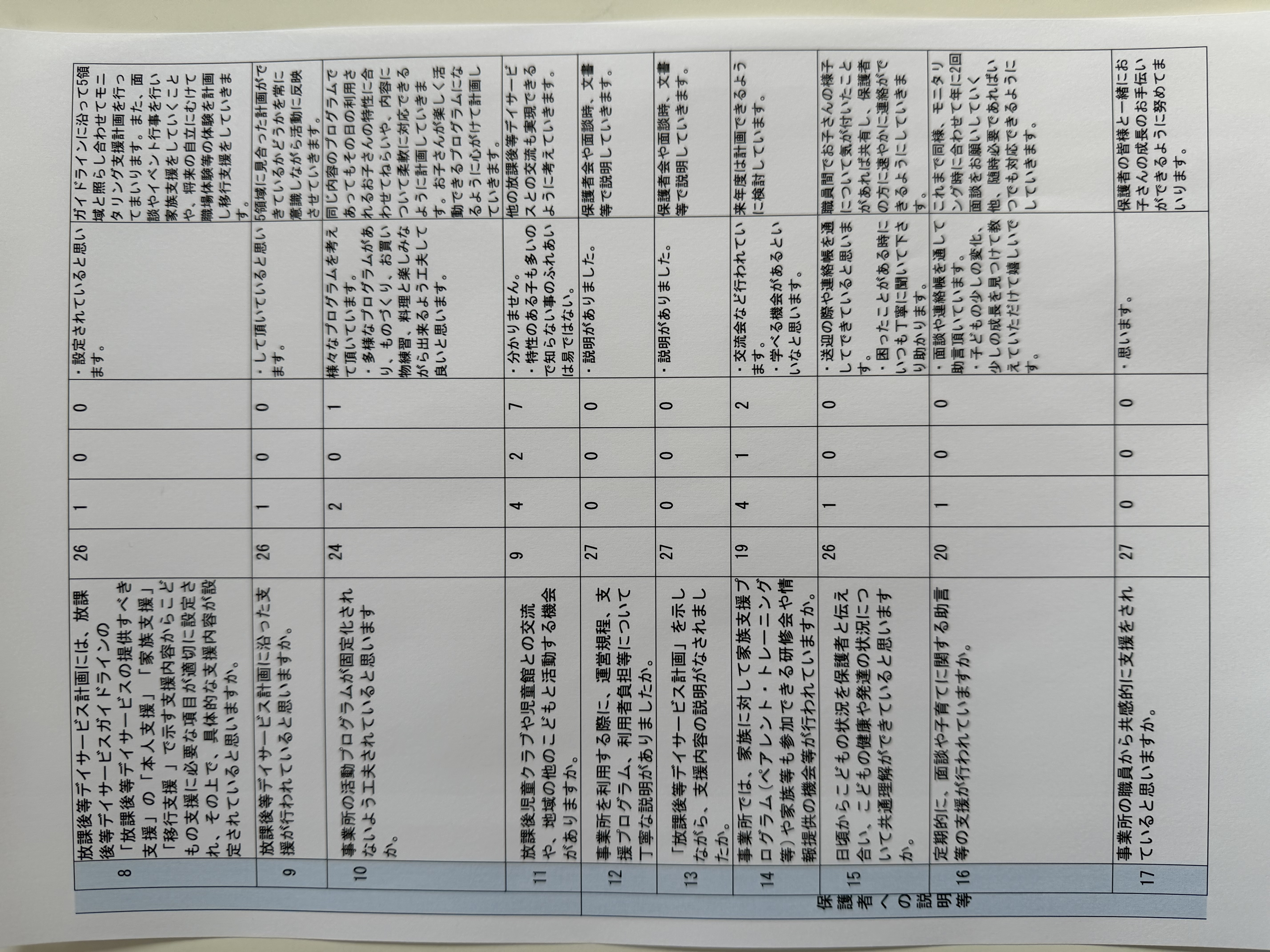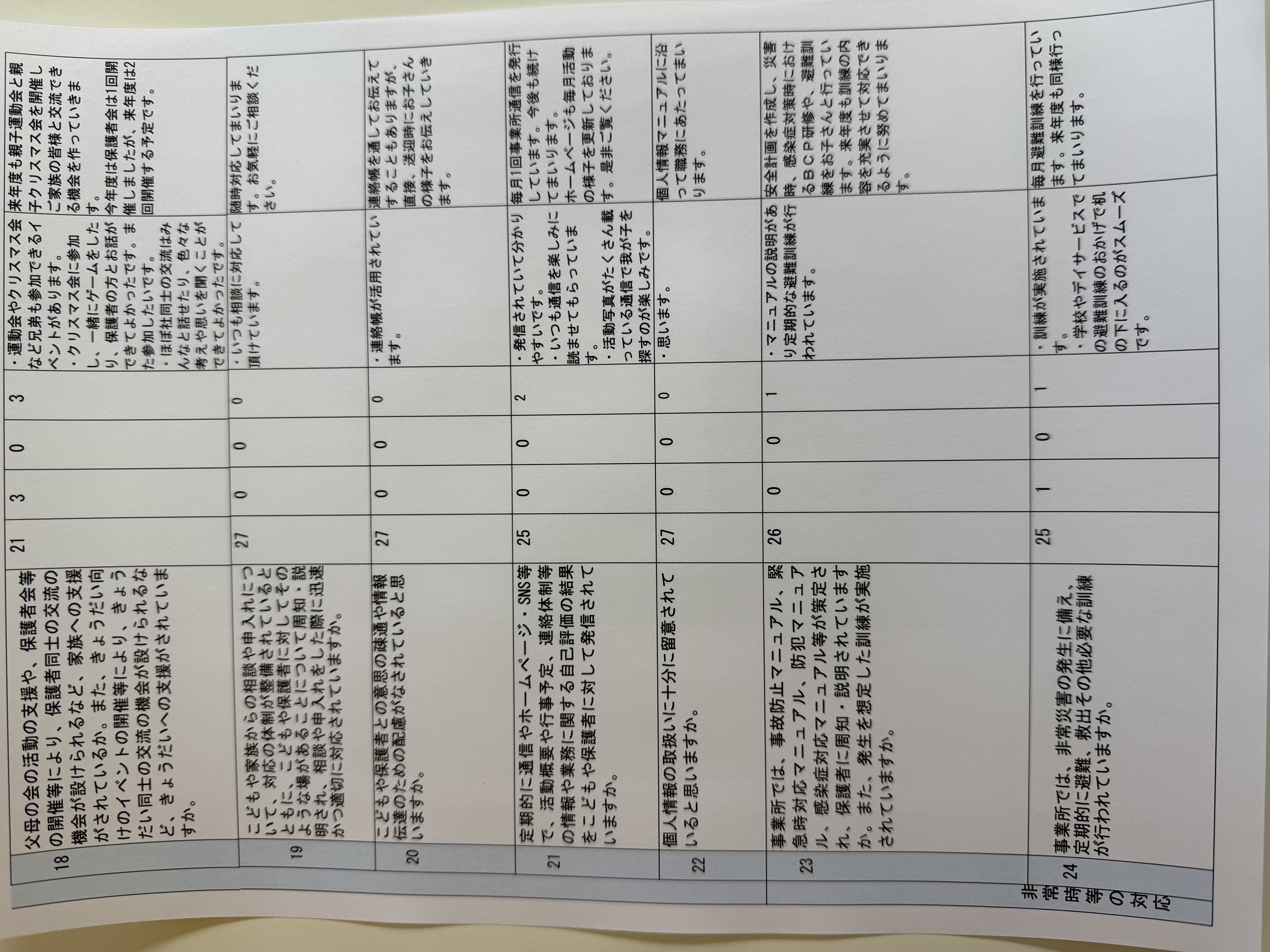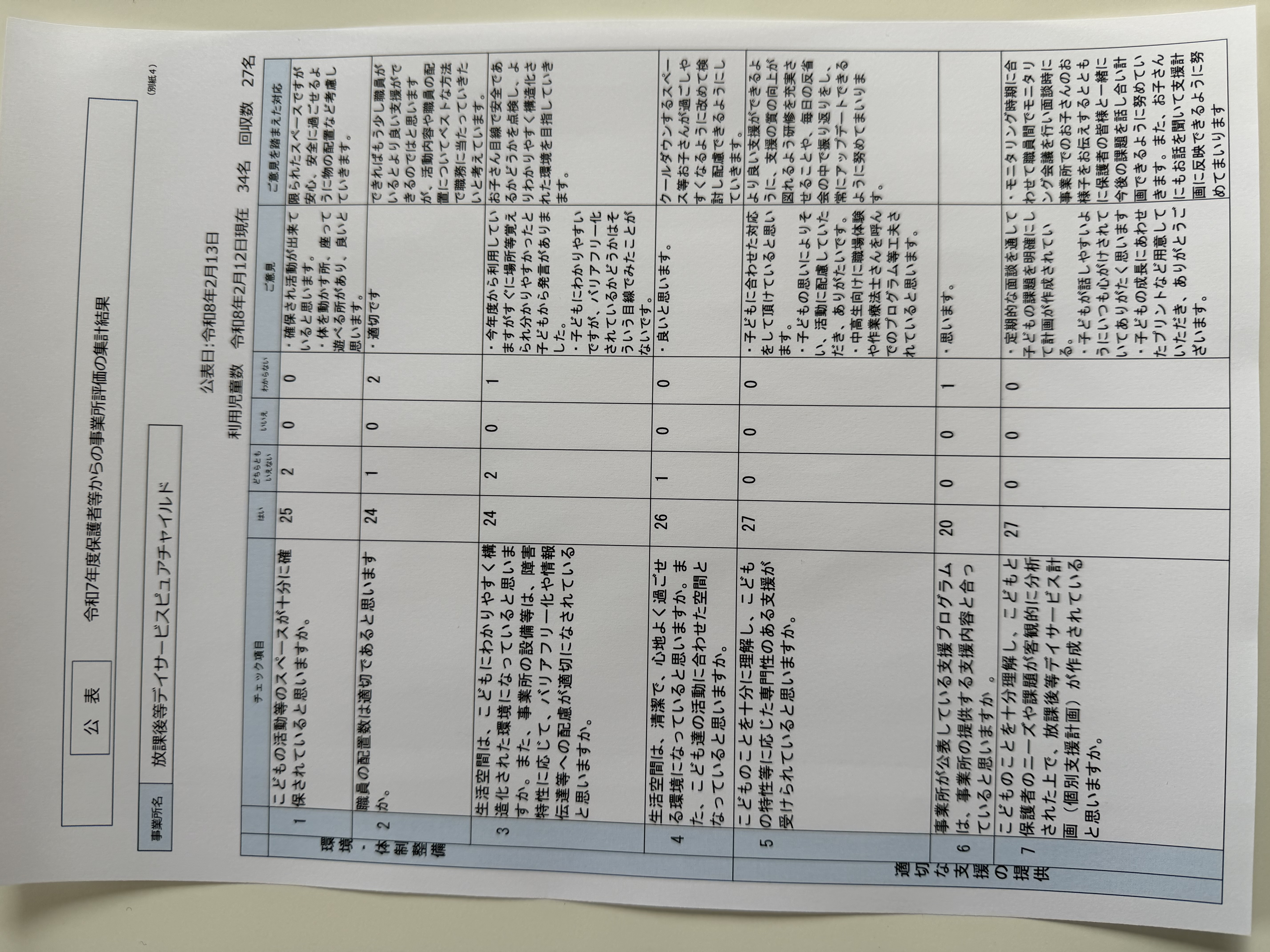 令和7年度事業所に関する保護者さまからの評価及び事業所における自己評価の公表です。保護者の皆様におかれましてはお忙しい中ご協力いただきましてありがとうございました。貴重なご意見をいただき感謝しております。この結果をふまえてより良い事業所をめざしてまいります。今後ともどうぞよろしくお願い申し上げます。